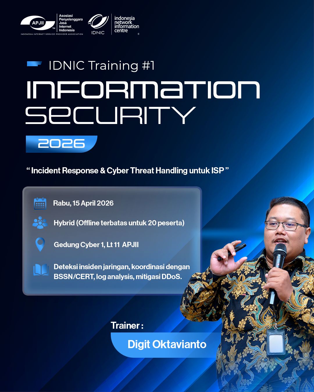 Digit merupakan seorang profesional keamanan siber dengan pengalaman lebih dari 14 tahun. Dia memiliki berbagai pengalaman mulai dari Managing Linux/Unix Server, Network Security, SIEM, Digital Forensic and Incident Response, Cyber Threat Intelligence, Threat Hunting, Compromise Assessment, SOC Gap Assessment & Development and Adversary {Sim|Em}ulation.